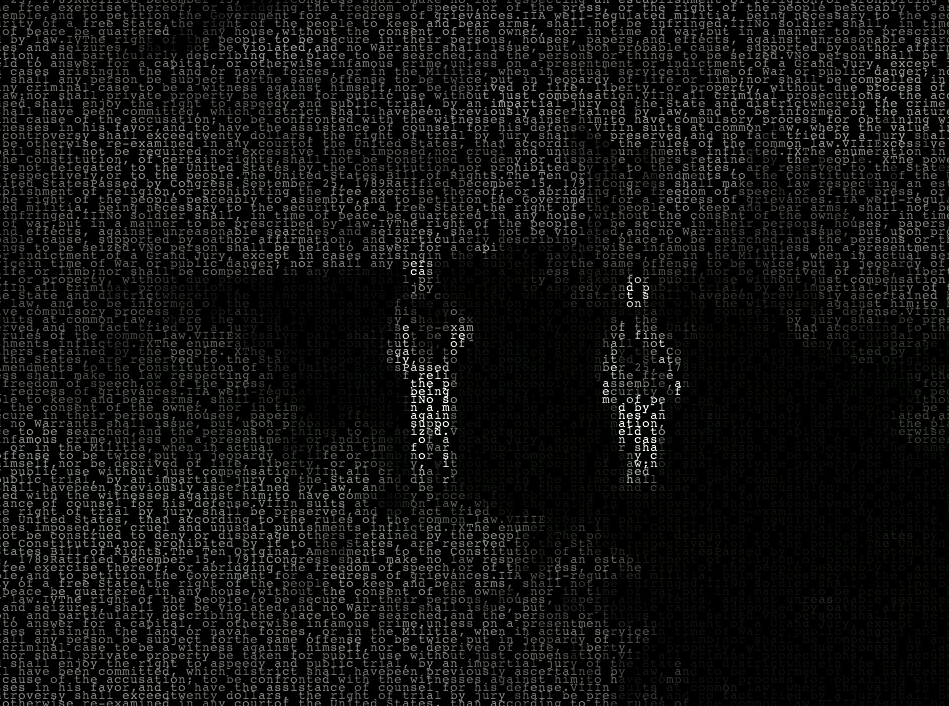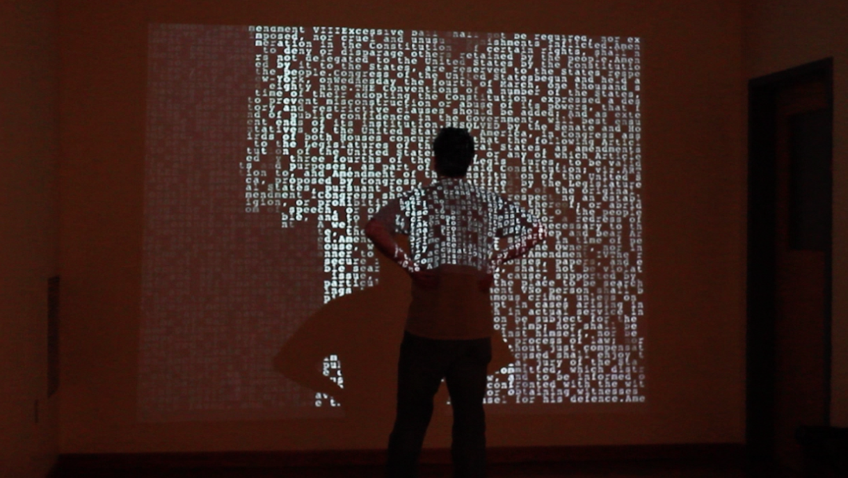 The stark black and white juxtaposition of the two elements is intended to highlight the glaring inconsistency between the United States’ promises of boundless opportunity and the stark realities many immigrants face. As raids, deportations, and detention centers grow dramatically in number along the increasingly fortified Mexican border, the many cameras that vigilantly maintain the “integrity” of United States borders capture a daily record of forgotten promises. The Crossing Rights uses processing software to combine the Bill of Rights text with a video of two immigrants trying to cross the border into the United States.
