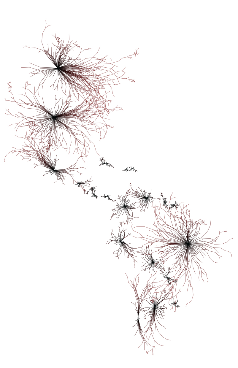 Many mathematical formulas have helped us understand the complexity of these shapes in a more straightforward, more understandable way. This works’ challenge is to bring these mathematical functions, which are random, to grow semi-controlled. They are drawn with code using Java and Processing based on geographic coordinates. I’m building molded structures geo data. In many pieces, the capital location is the point of origin, and the borders of each state mark the growth path for the fractal.
