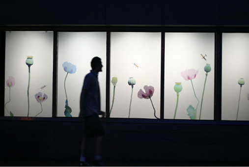 The installations consisted of the poppies flower photos I grew on my city garden in Lowe Roxbury. I installed the Decals in different public spaces such as the Massachusets College of Art, Babson Green Street Station Orange Line, and the Colombian Consulate.